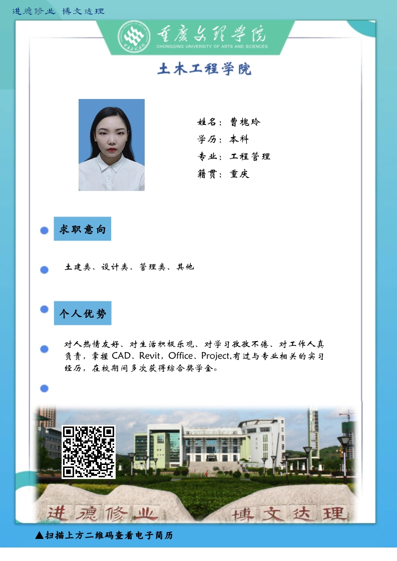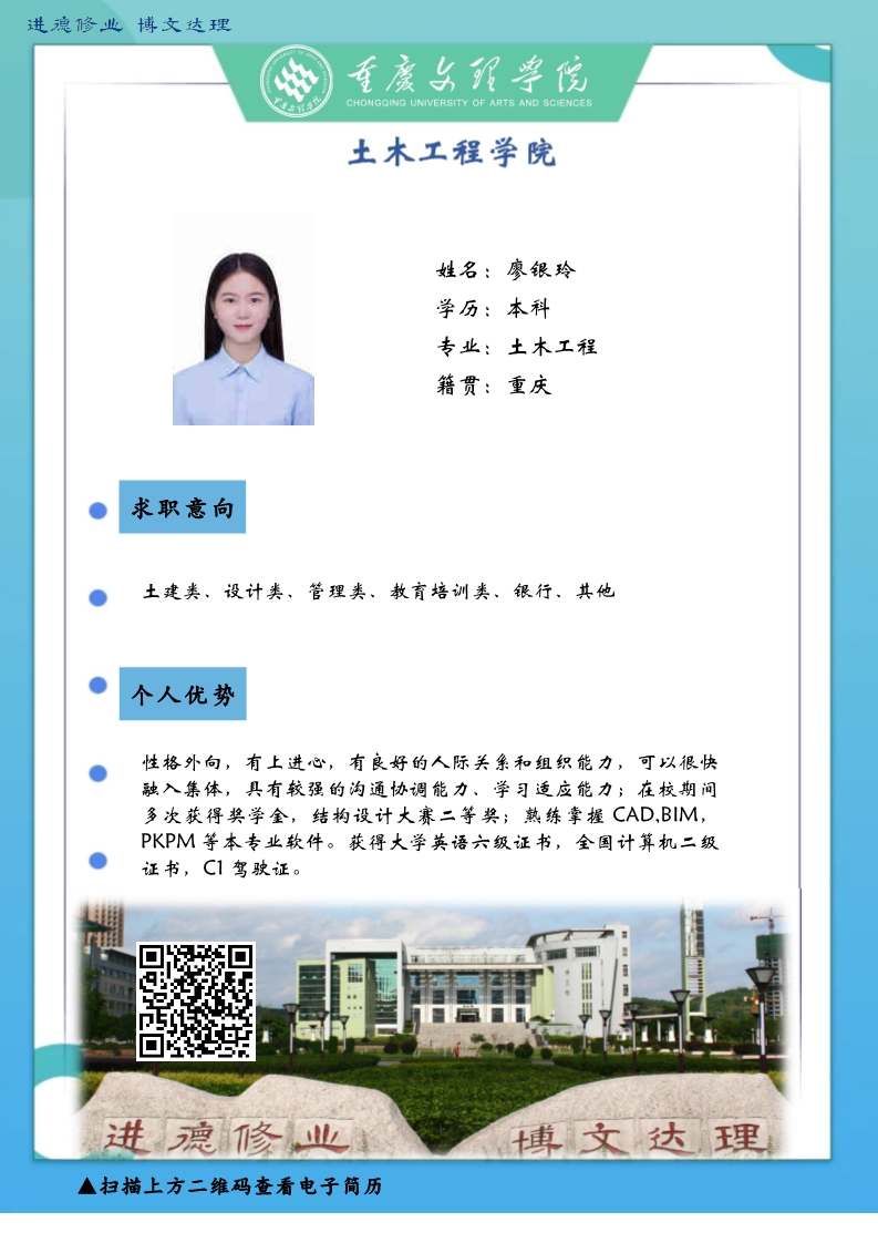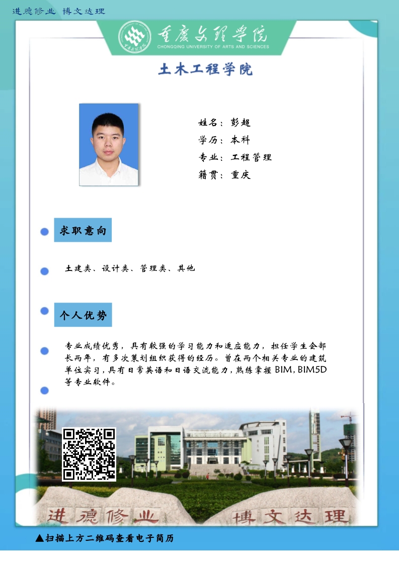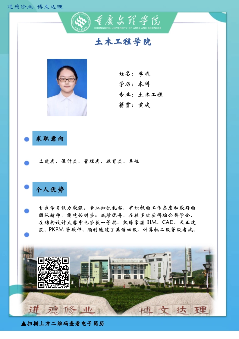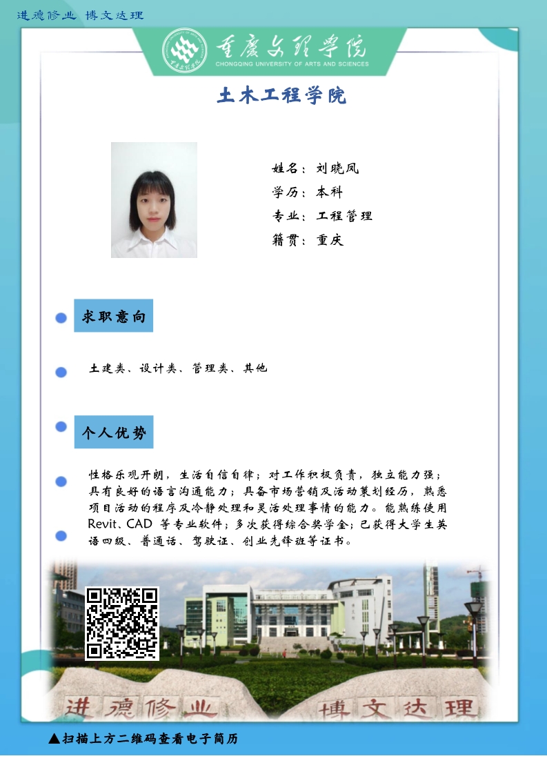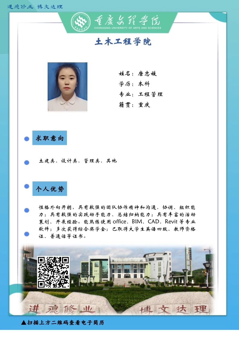 感谢您一直以来对重庆文理学院土木工程学院的支持和帮助。受疫情影响,学院2020届毕业生的就业面临着巨大的挑战。疫情无情人有情,文理人秉承“进德修业博文达理”的校训,困难面前勇向前,厚土承乾坤,众木支天下,土木学子更是坚韧务实肯干。线下招聘活动困难重重,不能当面向您推荐优秀人才,学生也不能当面向您自我介绍,特借此平台,把一些优秀毕业生信息线上发布,如果您或您的朋友有需求,请联系我们,说明单位名称、岗位基本信息和联系方式,我们会第一时间把学生简历呈上。待疫情过后,英才良驹助您事业兴旺发达,再展宏图新篇章!