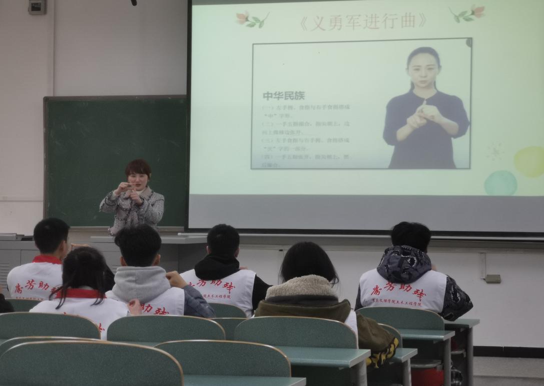 “一只手伸出食指,画一个圈,这是国。用手搭一个房子放在头顶,这是家。”一场充满趣味的手语培训课正在举行,在场15名志愿者在专业手语老师的带领之下学习手语歌《义勇军进行曲》,及一些基本的手语动作,如“谢谢”、“你好”、“吃饭”等。最后,志愿者们集体观看了由全国政协委员、中国残疾人艺术团团长邰丽华用手语表演国歌的视频。