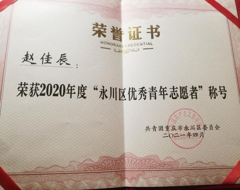4月28日下午,为表彰先进、树立典型,进一步推动深学笃用习近平新时代中国特色社会主义思想,鼓舞全区广大团员青年积极投身永川的经济社会发展中,团区委在永川区文化艺术中心举行了“永川共青团纪念‘五•四’运动102周年文艺汇演暨颁奖仪式”。其中我院赵佳辰同学荣获“永川区优秀青年志愿者”称号。