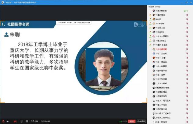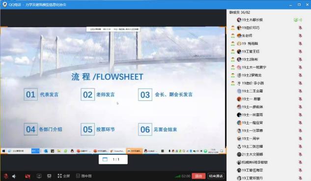 2021年11月28日下午三点,按照疫情防控相关要求,力学及建筑模型信息化协会于线上召开社员见面大会。协会指导老师朱聪,贺建,社团全体干部,以及社员共计八十余人参与本次会议。本次会议由协会财务部副部长鄢长银主持。