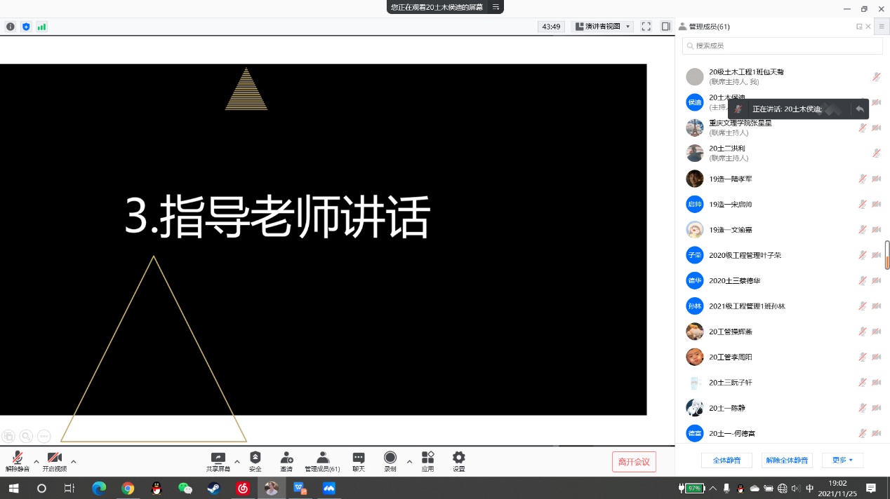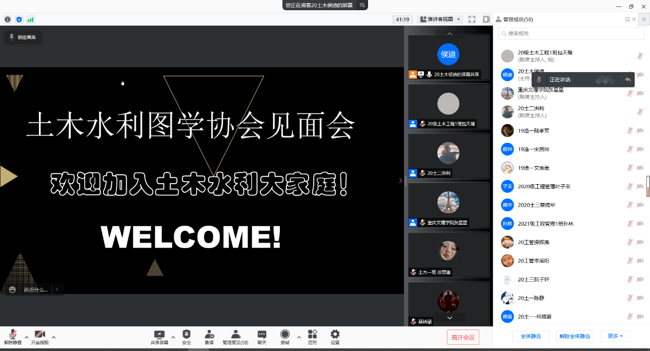 11月25日,按照疫情防控相关要求,土木水利图学协会于线上召开社员见面大会。协会指导老师张星星,社团全体干部,以及社员共计六十余人参与本次会议。本次会议由协会副社长侯迪主持。