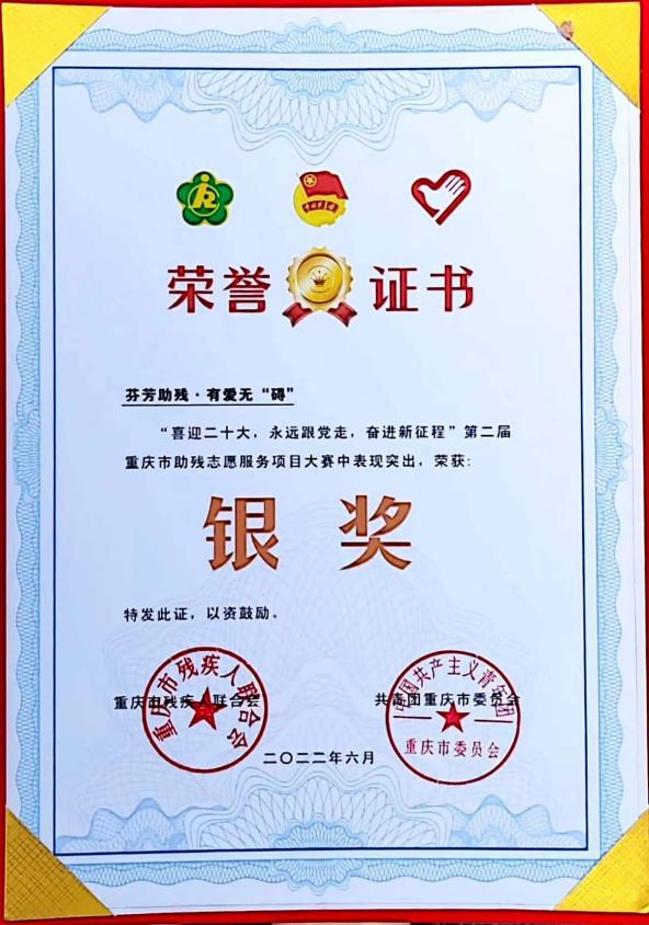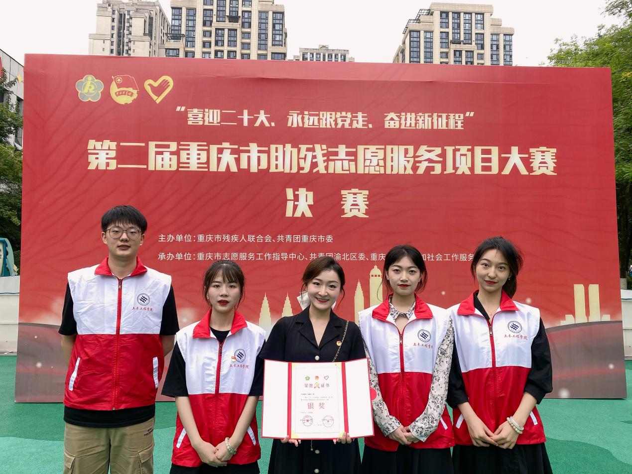 6月9日,由团市委、市残联联合主办的“喜迎二十大、永远跟党走、奋进新征程”第二届重庆市助残志愿服务项目大赛决赛在渝北区举行。本次大赛自4月启动以来,全市共有58个项目参赛,经过层层筛选以及淘汰赛,我院芬芳助残•有爱无“碍”项目团队突出重围进入决赛,以视频+演讲的路演形式将项目完美呈现。在最终的决赛中表现优异,斩获银奖!
