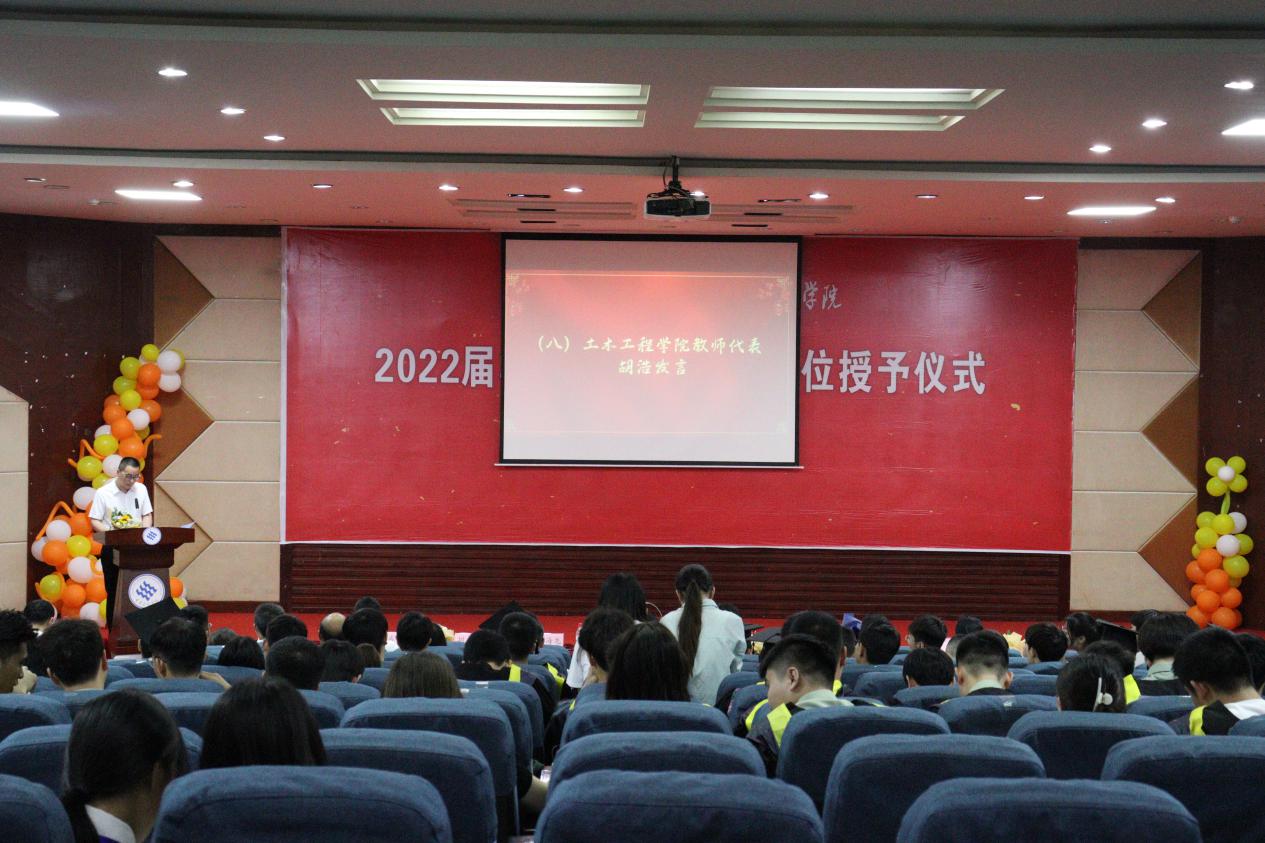 教师代表胡浩上台发言,他表示在与同学们的四年里,他看着各位同学从懵懂无知一步步走向成熟,这四年的时光终将成为他们记忆中最珍贵的画面,最后胡老师祝各位同学们前程似锦,毅然前行。随后,蒋礼文书记宣读《关于土木工程学院2022届毕业生学位授位决定》。